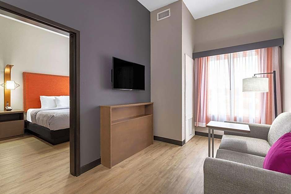 This suite has a cable TV, .microwave, refrigerator, and coffee machine.